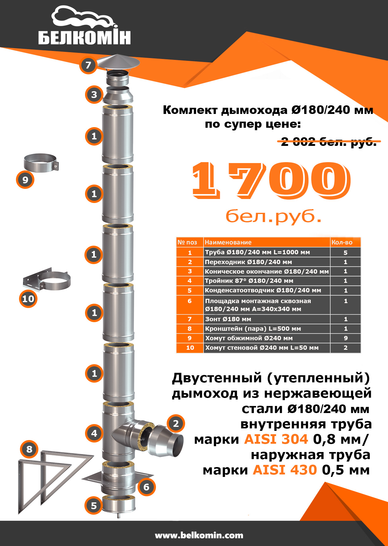 Для полноценного функционирования системы дымохода компания ООО «БелКомин» производит все составляющие элементы, фитинги только из качественной европейской нержавеющей стали только аустенитного класса AISI 316, 316L, 304 и 310.
