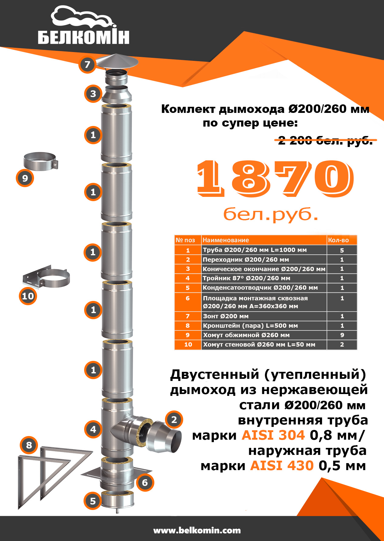 Комплект утепленного дымохода ф200/270 мм (5 метров) AISI 304-0,8мм/AISI 304-0,5мм