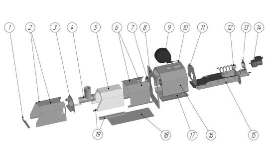 Процесс горения происходит в камере сгорания, которая расположена в туннеле горелки. Перед работой горелка соединяется с автоматикой и шнеком, который вставляется в бункер.